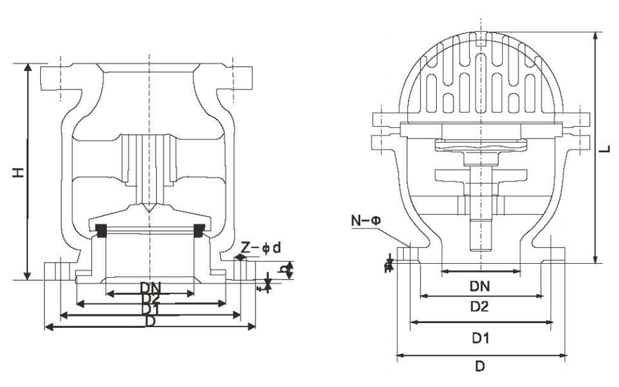 | PN | DN | H | D | D1 | D2 | b | f | Z-φd |