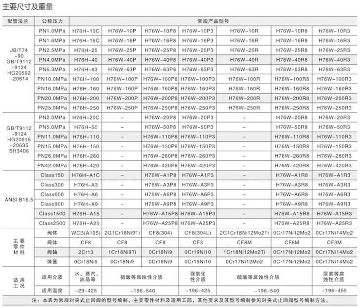 对夹式止回阀适用于公称压力PN1.0MPa~42.0MPa、Class150~2500;公称通径DN12~1200mm、NPS1/2~48;工作温度-196~540℃的各种管路上,用于防止介质倒流。通过选用不同的材质,可适用于水、蒸汽、油品、硝酸、醋酸、强氧化性介质及尿素等多种介质。